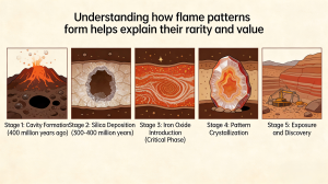 The complete guide to flame pattern nanhong agate — the rarest and most coveted variety. Learn why collectors pay premium prices, how to grade flame