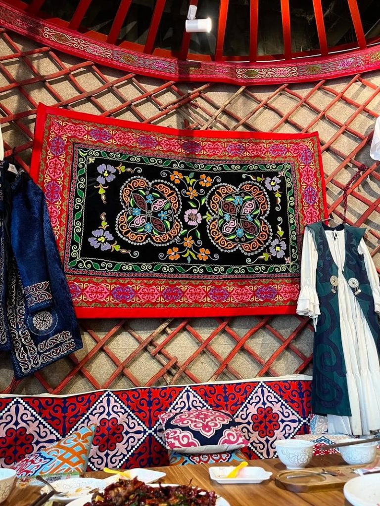 The yurt was warm and brightly lit, with colorful rugs covering the floor and walls. A large portrait of the Kazakh president hung near the entrance. Nurlan’s wife, Gulnara, greeted us with bowls of hot tea and a platter of traditional snacks: dried fruits, nuts, and flaky bread.